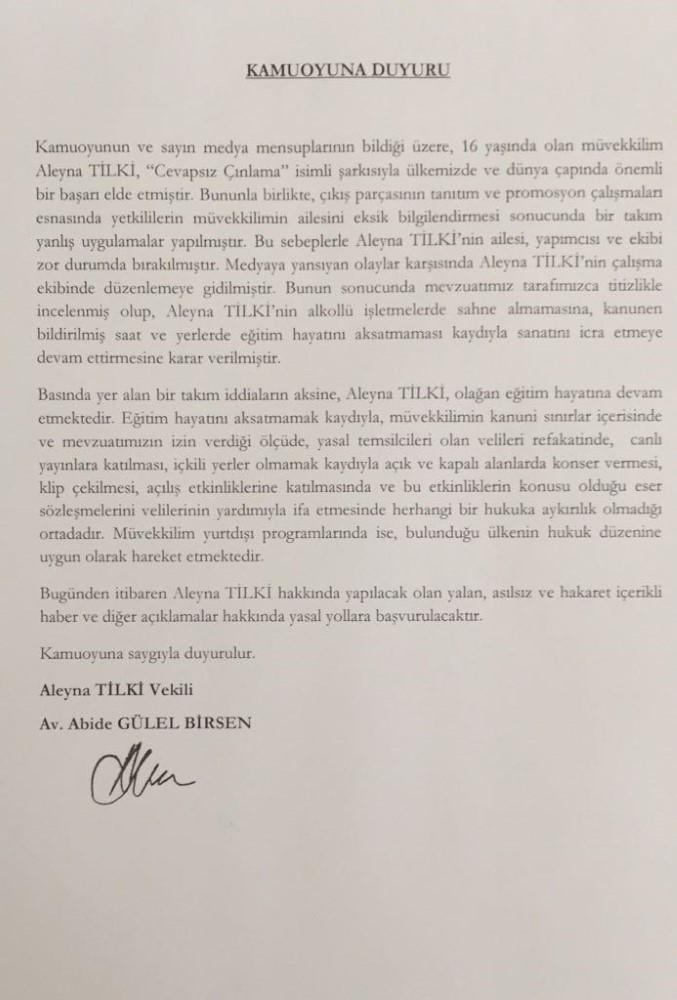 16 yaşında olan müvekkilim Aleyna Tilki, Cevapsız Çınlama isimli şarkısıyla ülkemizde ve dünya çıpanda önemli bir başarı elde etmiştir. Bununla birlikte, çıkış parçasının tanıtım ve promosyon çalışmaları esnasında yetkililerin müvekkilimin ailesini eksik bilgilendirmesi sonucunda bir takım yanlış uygulamalar yapılmıştır. Medyaya yansıyan olaylar karşısında Aleyna Tilki'nin çalışma ekibinden düzenlemeye gidilmiştir. Bunun sonucunda Aleyna Tilki'nin alkollü işletmelerde sahne almamasına, kanunen bildirilmiş saat ve yerlerde eğitim hayatını aksatmaması kaydıyla sanatını icra etmeye devam ettirmesine karar verilmiştir dendi.