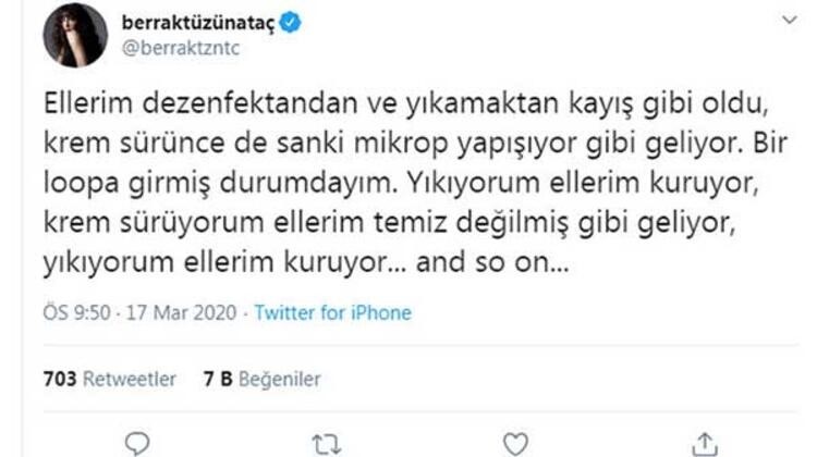 35 yaşındaki oyuncu Berrak Tüzünataç, tüm dünyayı etkisi altına alan corona virüse karşı, aldığı önlemleri abarttığını söyledi.