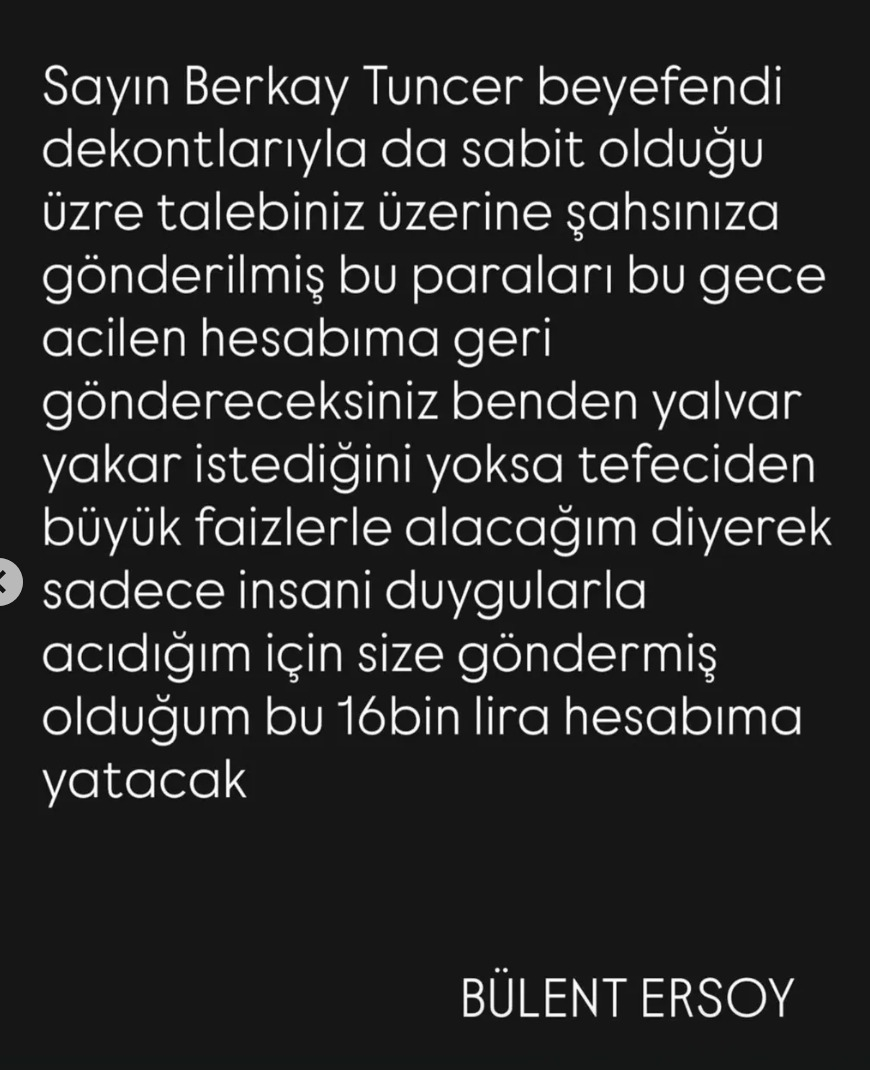 Duygusal nedenlerle bu parayı verdiğini belirten Ersoy, “Benden yalvar yakar istediğinizi, yoksa tefeciden büyük faizlerle alacağım diyerek sadece insani duygularımla acıdığım için göndermiş olduğum bu 16 bin lira hesabıma yatacak” sözleriyle sitem etti.