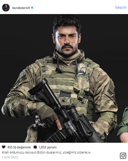Burak Özçivit sosyal medya hesabından “Zeytin Dalı Harekatı” ile ilgili paylaşımda bulundu. Can Feda aldı projesinde bir askeri canlandıran Burak Özçivit, Instagram hesabından yer aldığı projeden çekilmiş asker üniformalı bir fotoğrafını paylaşarak “Allah ordumuzu korusun. Bütün dualarımız, yüreğimiz sizlerle” yazdı. Ünlü oyuncunun bu paylaşımı 700 binden fazla beğeni aldı.