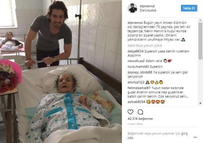 Fazilet Hanım ve Kızları dizisinde ‘Sinan Egemen’ karakterini canlandıran Alp Navruz, geçtiğimiz gün dizinin en yaşlı sevenlerinden birini Okmeydanı Darülaceze’ye giderek ziyaret etti. Mutluluğunu Instagram hesabından paylaştığı bir fotoğraf ile belirten Alp Navruz fotoğrafın altına; ‘Bugün yayın öncesi dizimizin sıkı takipçilerinden 75 yaşında, çok tatlı bir teyzemize, Nevin Hanım'a huzur evinde sürpriz bir ziyaret yaptık.. Onların yalnızlıklarını unutmaya ihtiyacı var.’ notunu düştü.