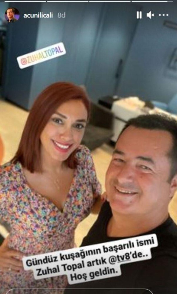 Acun Ilıcalı, Instagram hesabından Zuhal Topal ile pozunu paylaşarak "Gündüz kuşağının başarılı ismi Zuhal Topal artık TV8'de. Hoş geldin" dedi.
