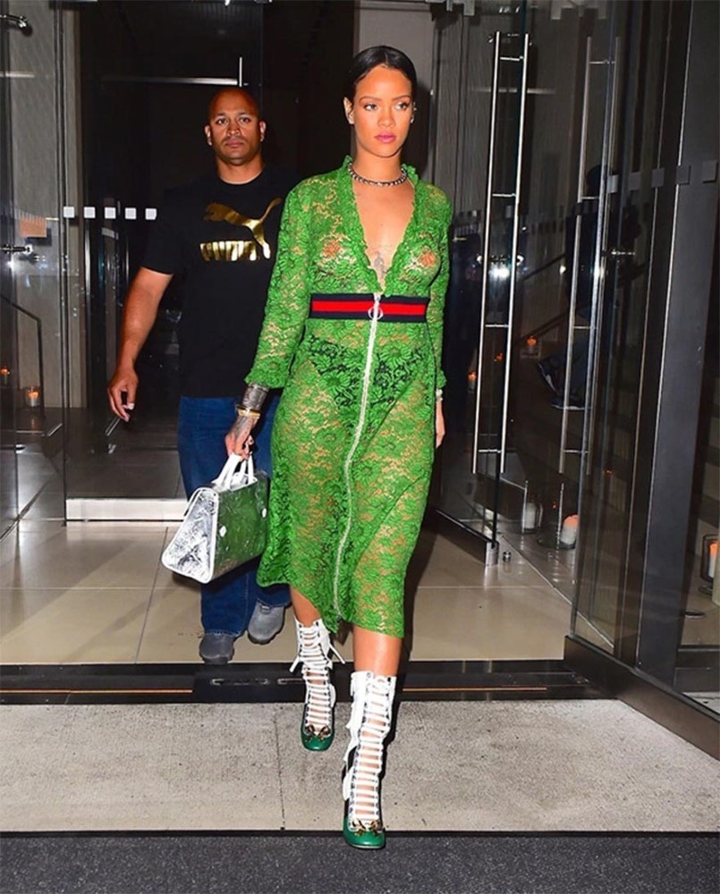 Dünyaca ünlü star Rihanna, yeşil dantel elbisesiyle New York sokaklarında görüntülenmişti. Flaşların patlamasıyla, Rihanna’nın dantel elbisesinin içine sütyen takmadığı görülmüştü. Tabii bu Rihanna için yeni bir sütyensiz görüntülenme olayı değil. Ancak aynı elbiseyi Demet Akalın giyince işler değişiyor. Tabii ki ünlü sanatçı elbisenin içine ten rengi astar diktirmeyi tercih etmiş.