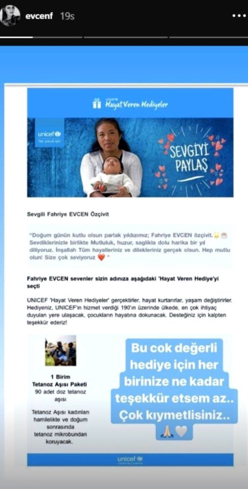 35 yaşına giren Fahriye Evcen'e doğumgününde hediye yağdı. Sosyal medyada 10 milyondan fazla takipçisi bulunan Evcen adına hayranları Unicef gibi çeşitli derneklere bağışta bulundu. Hayranları kendi aralarında anlaşarak Unicef'e Tetanoz aşısı bağışladı. Bergüzar Korel'in sevenleri de Afrika'da su kuyusu açtırmıştı.