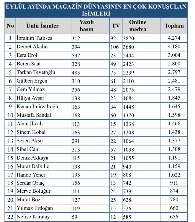 Listelerin vazgeçilmez isimlerinden olan Demet Akalın, 4 bin 180 habere konu olarak ikinci sırada yer aldı. Uzun yıllardır sürekli tartışmalarla gündeme gelen Demet Akalın ve Hande Yener ikilisinin aralarındaki polemik Eylül ayında da manşetlere yansıdı. Hande Yener ise bin 22 habere konu oldu.