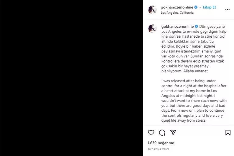 "Dün gece yarısı Los Angeles’ta evimde geçirdiğim kalp krizi sonrası hastanede bir süre kontrol altında kaldıktan sonra taburcu edildim. Böyle bir haberi sizlerle paylaşmayı istemezdim ama iyi gün var kötü gün var. Bundan sonrasında kontrollere devam edip stresten uzak çok sakin bir hayat yaşamayı planlıyorum. Allah'a emanet."