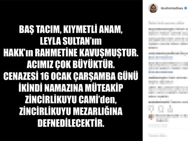 Ünü sanatçı, instagram hesabından yaptığı paylaşımda, "Baş tacım, kıymetli anam, Leyla Sultan'ım Hakk'ın rahmetine kavuşmuştur. Acımız çok büyüktür. Cenazesi 16 Ocak çarşamba günü ikindi namazına müteakip Zincirlikuyu Camii'nden Zincirlikuyu Mezarlığı'na defnedilecektir" ifadelerini kullandı.