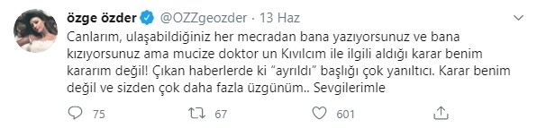 Fox TV ekranlarında yayınlanan MF Yapım imzalı Mucize Doktordizisinin kadrosundan ayrılan oyuncu Özge Özder'den bir açıklamageldi. Özder, kadrodan çıkmasının kendi kararı olmadığını ifade etti. İzleyicilerden gelen tepkiler üzerine Twitterhesabından bir açıklama yapan Özder, kadrodan kendi isteğiyle ayrılmadığını ifade ederek "Çıkan haberlerde ki 'ayrıldı' başlığı çok yanıltıcı. Karar benim değil ve sizden çok daha fazla üzgünüm" dedi.