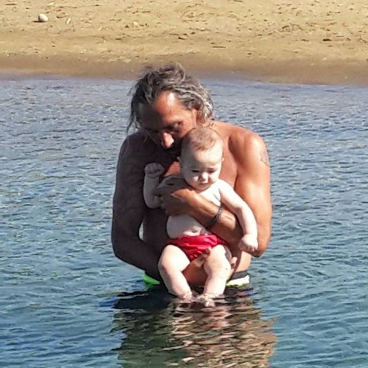 Babasının kucağında denize giren minik bebeğin mutlu halleri dikkatlerden kaçmadı.
