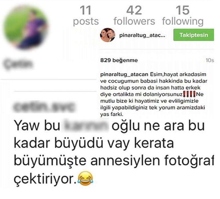 “Eşim, hayat arkadaşım ve çocuğumun babası hakkında bu kadar hadsiz olup sonra da insan hatta erkek diye ortalıkta mı dolanıyorsunuz! Ne mutlu bize ki hayatımız ve evliliğimizle ilgili yapabildiğiniz tek yorum aramızdaki yaş farkı.”