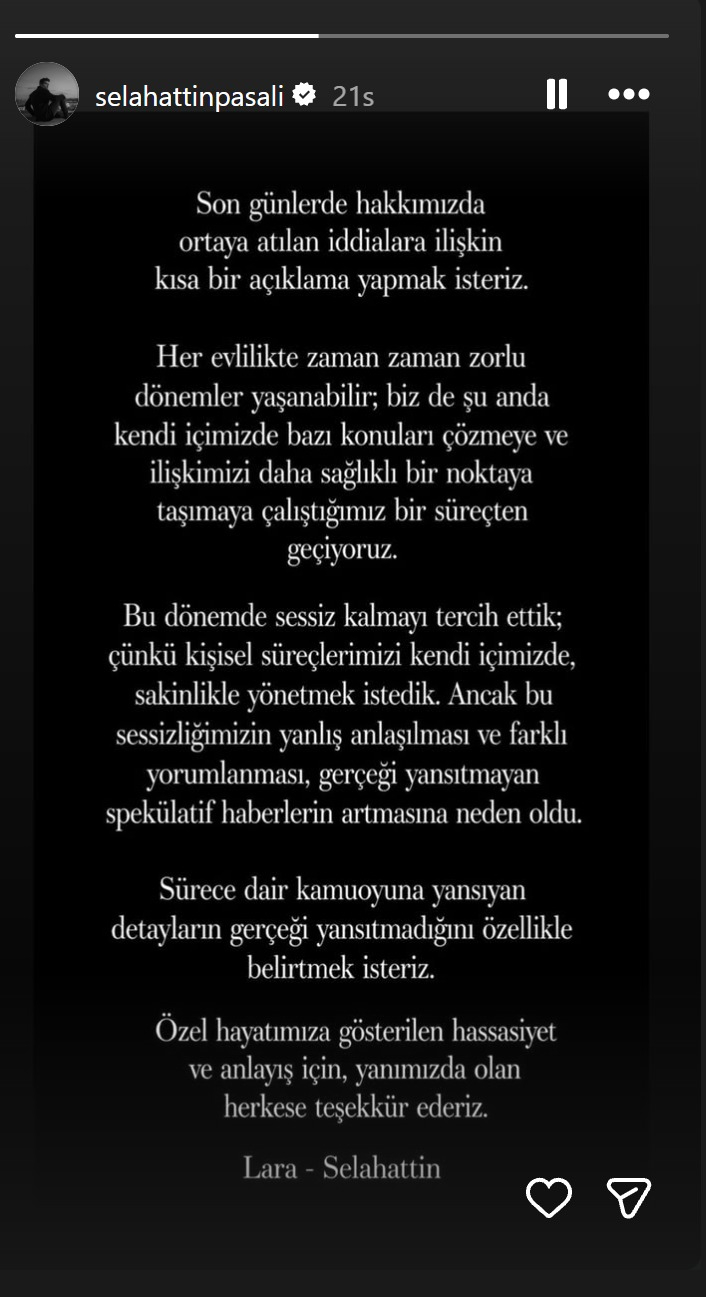 Selahattin Paşalı- Lara Paşalı çifti evliliklerinde kriz iddialarına yönelik açıklama yaptı.