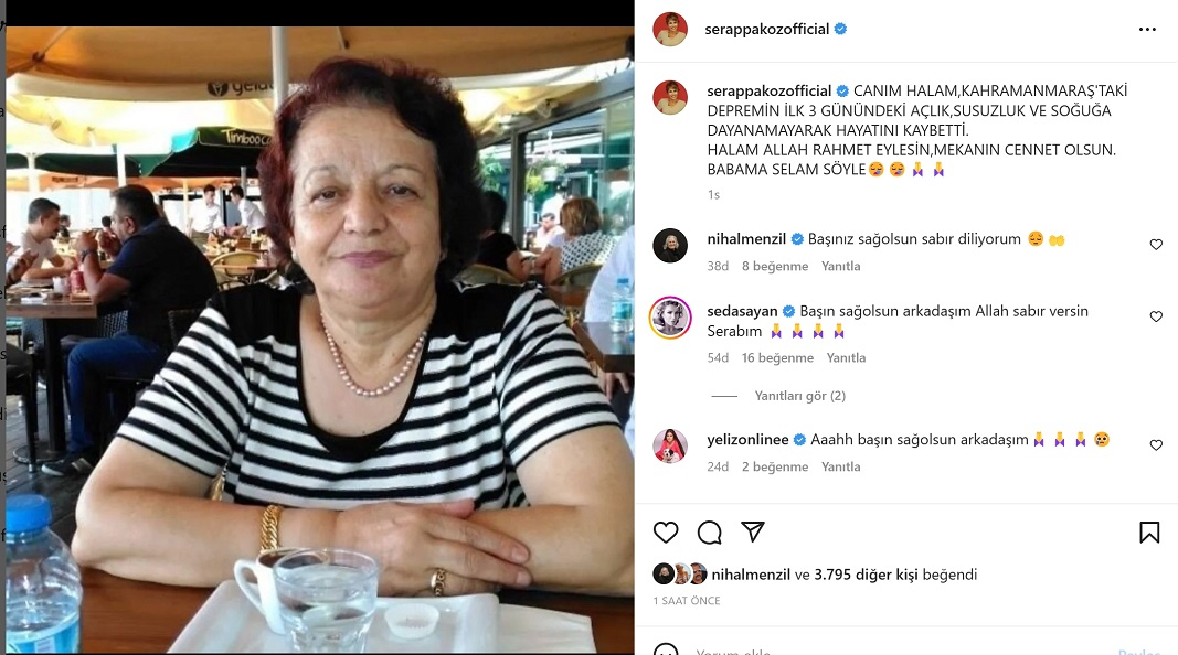 Paköz, yaptığı paylaşımda CANIM HALAM,KAHRAMANMARAŞ'TAKİ DEPREMİN İLK 3 GÜNÜNDEKİ AÇLIK,SUSUZLUK VE SOĞUĞA DAYANAMAYARAK HAYATINI KAYBETTİ.