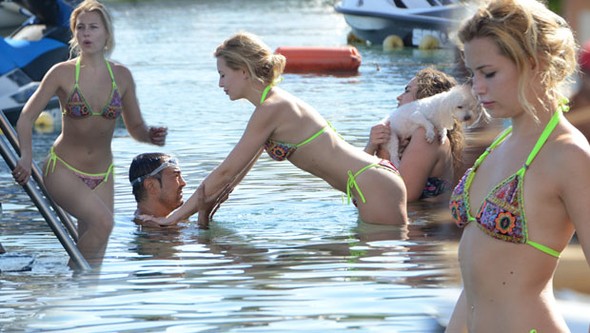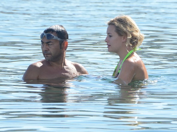 Denize girip bir süre yüzen Ortaç, eşini de yanına çağırdı. Şarkıcı, su soğuk olduğundan denize girmekte tereddüt eden eşine onu kollarından tutup suya çekerek yardımcı oldu.