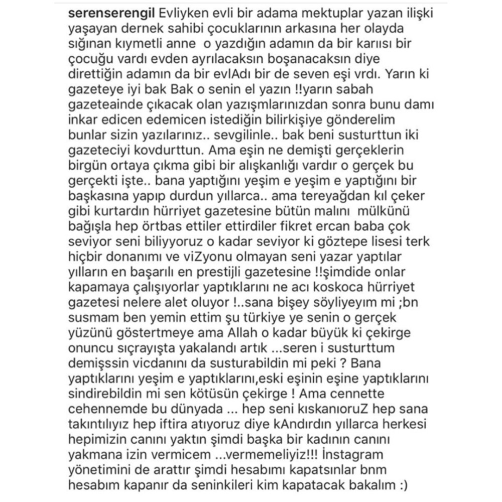 Sana bir şey söyleyeyim mi… Ben susmam, ben yemin ettim… Şu Türkiye’ye senin o gerçek yüzünü göstertmeye ama Allah o kadar büyük ki benim bir çaba sarfetmeme gerek kalmıyor. Çekirge onuncu sıçrayışta yakalandı artık. ‘Seren’i susturttum’ demişssin vicdanını da susturabildin mi peki? Bana yaptıklarını, Yeşim’e yaptıklarını, eski eşinin eşine yaptıklarını sindirebildin mi? Sen kötüsün çekirge! Ama cennette cehennemde bu dünyada… Hep seni kıskanıyoruz hep sana takıntılıyız hep iftira atıyoruz diye kandırdın yıllarca herkesi, hepimizin canını yaktın… Şimdi başka bir kadının canını yakmana izin vermeyeceğim. Vermemeliyiz! Instagram yönetimini de arattır şimdi hesabımı kapatsınlar. Benim hesabım kapanır da seninkileri kim kapatacak bakalım”