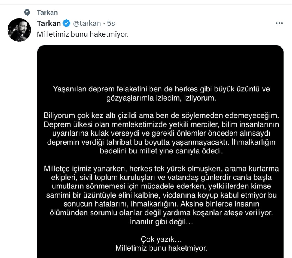 Tarkan paylaşımında şu satırlara yer verdi;