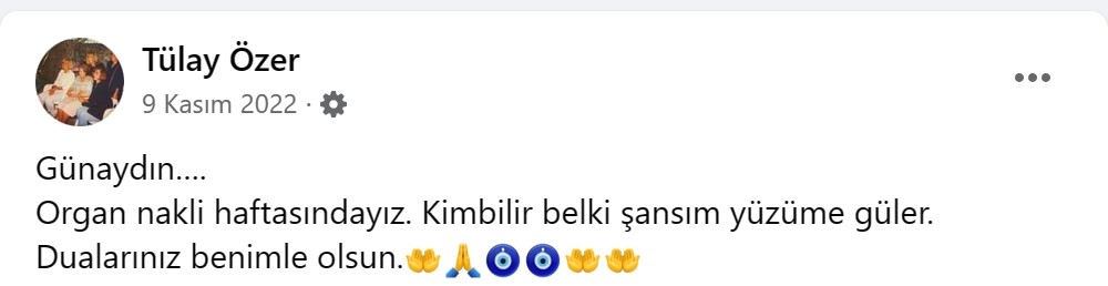 Sosyal medya hesabından sıkça paylaşımlar yapan Tülay Özer son olarak "Organ nakli haftasındayız. Kimbilir belki şansım yüzüme güler" dedi.