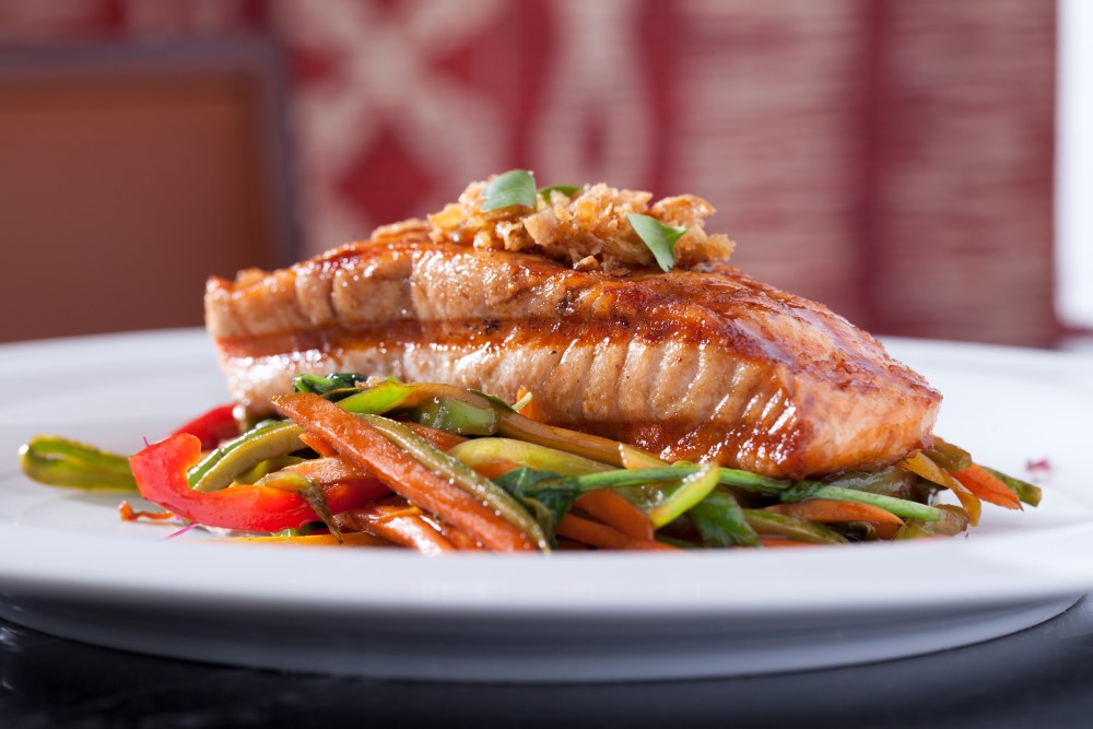 Teriyaki sos ile sırlanmış Somon Izgara, karışık sebze eşliğinde sunuluyor. Çok lezzetli.